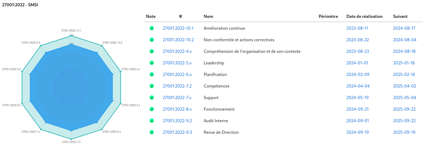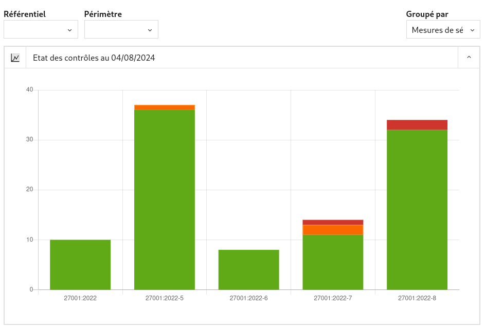 Dashboards Tableaux de bord¶ Il existe trois tableaux de bord : les contrôles par domaine les contrôle par domaine et par mesure les contrôles par attribut Les contrôles par domaines¶ Les contrôles par domaines et par mesures¶ Les contrôles par attributs¶