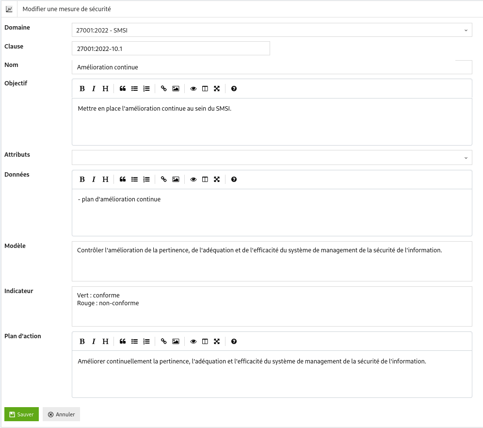 « Sauver », les modifications sont sauvées et vous revenez à l’écran d’affichage de la mesure de sécurité.