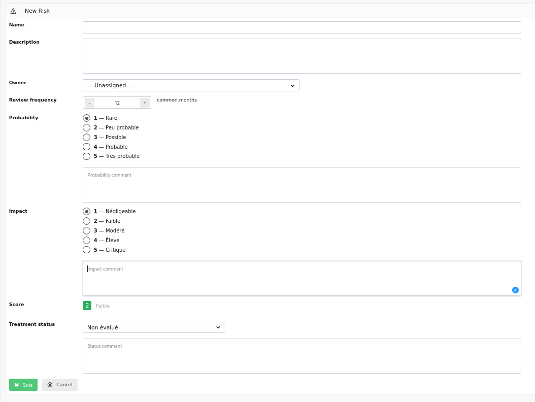 - Status — one of: Unassessed, Not accepted, Temporarily accepted, Accepted, Mitigated, Transferred, Avoided;
