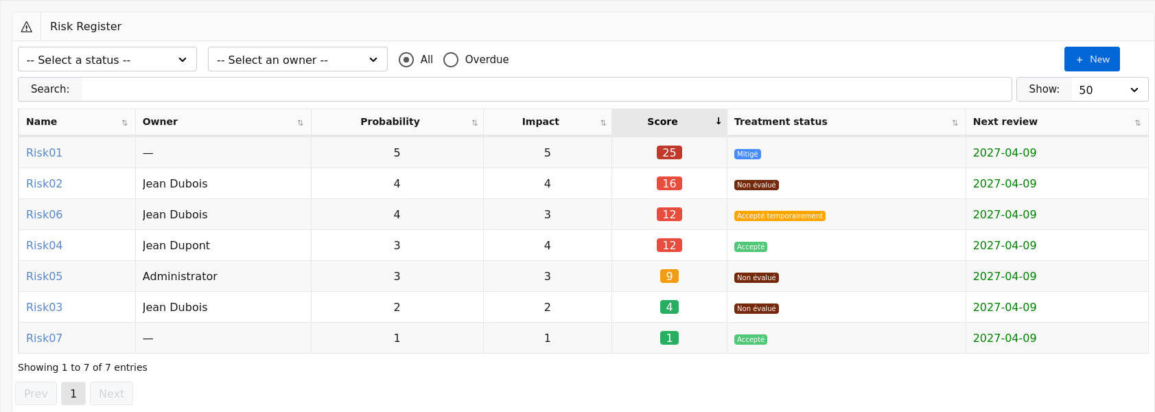 - Treatment status — Unassessed, Not accepted, Accepted, Mitigated, etc.