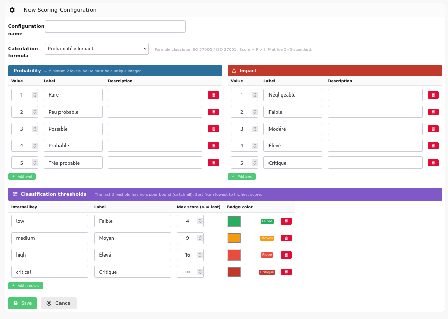 - The detail of the configured levels (probability or exposure/vulnerability, impact);