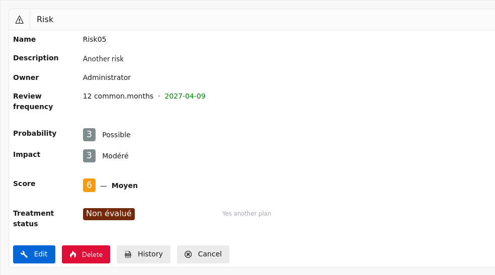 This screen allows you to modify an existing risk. It contains the same fields as the create screen, with the addition of: