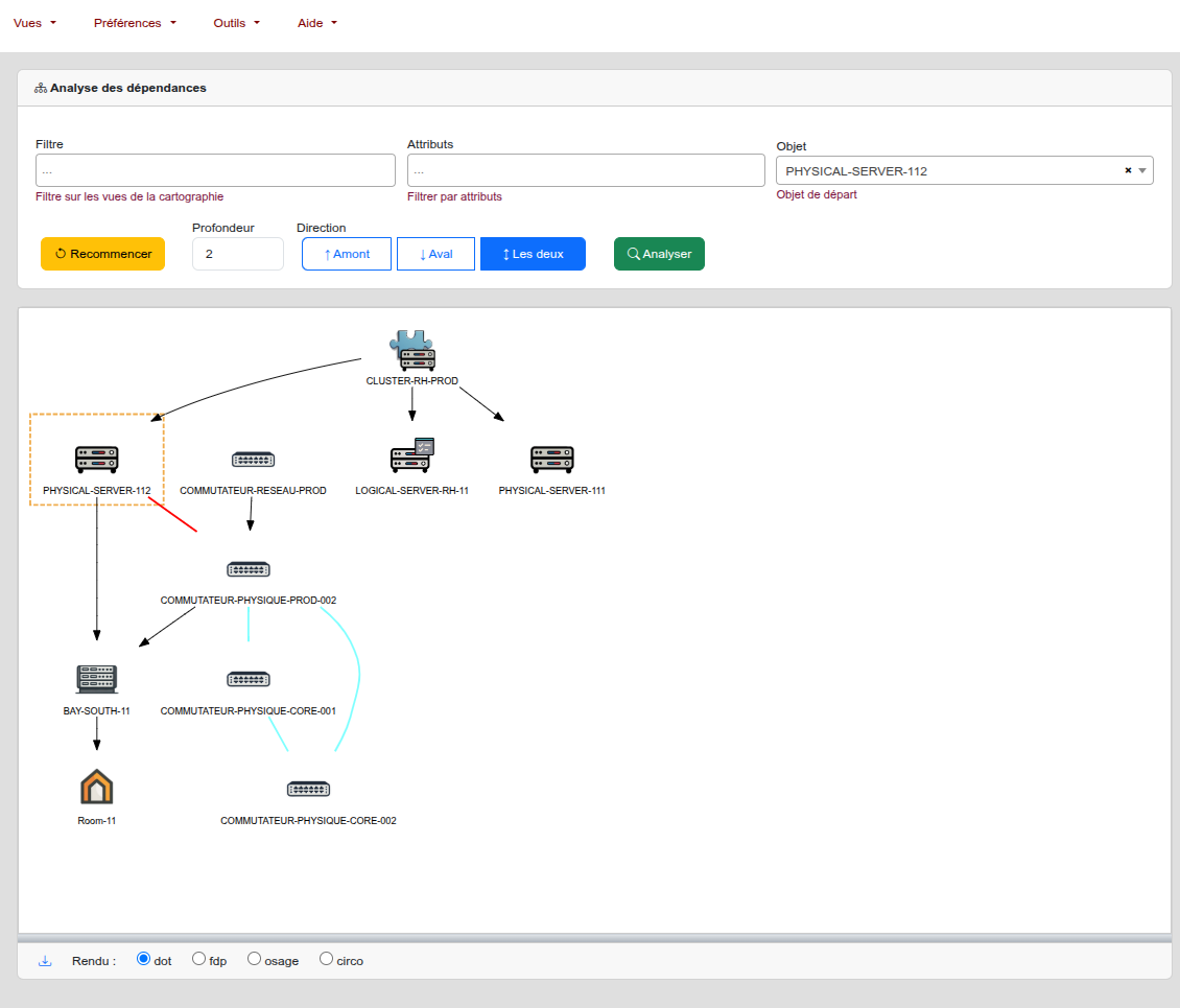 Mercator permet d'analyser le graphe de dépendances de n'importe quel objet du système d'information, en ammont ou en aval et ce sur plusieurs niveaux. Cet écran d'analyse est accessible depuis le menu supérieur "outils".