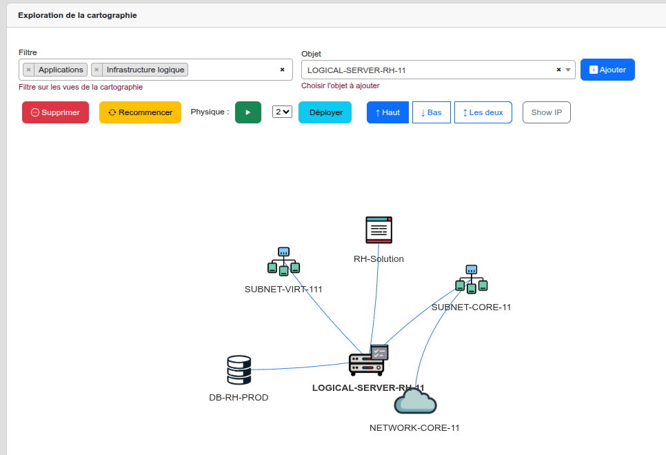 Avec filtres "Applications" + "Infrastructure logique" : RH-Solution et DB-RH-PROD apparaissent.