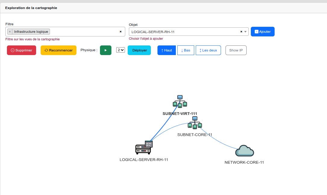 | ↓ Bas | Vers les couches inférieures | Descend vers l'infrastructure, les serveurs et les réseaux qui supportent cet asset | Application → VM → Serveur physique → Baie → Site |